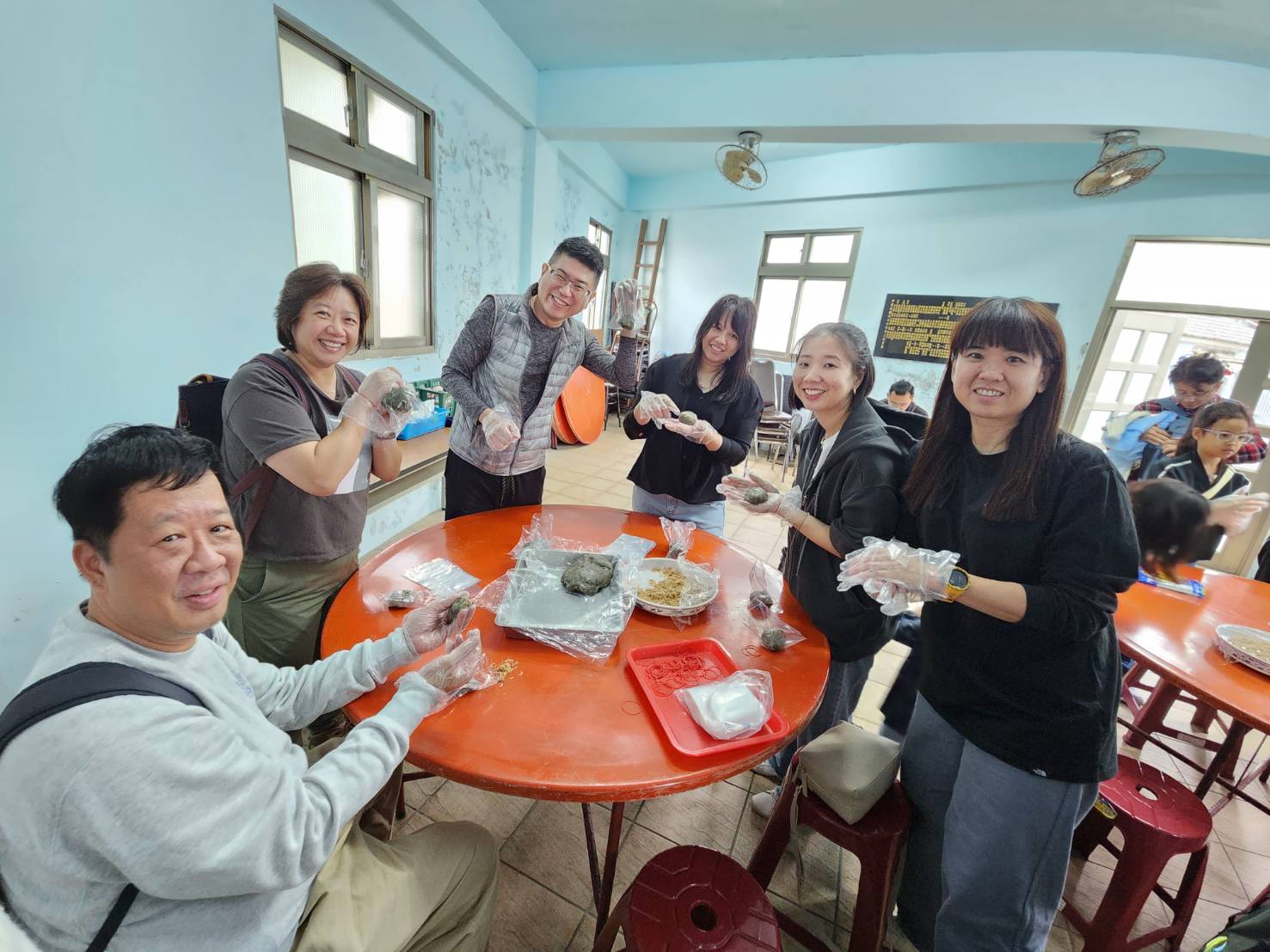 "草仔粿" (tsaozi guo; rice cake/mochi), is a type of traditional rice snack where dried/pickled mugwort herb is stuffed inside the pounded rice cake. The participants learned how to make the Mao'ao-style tsao guo where local grass was used instead of traditional mugwort.